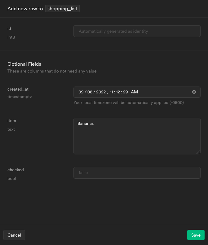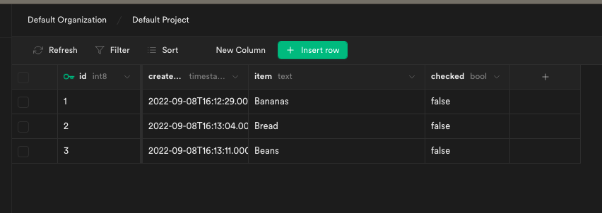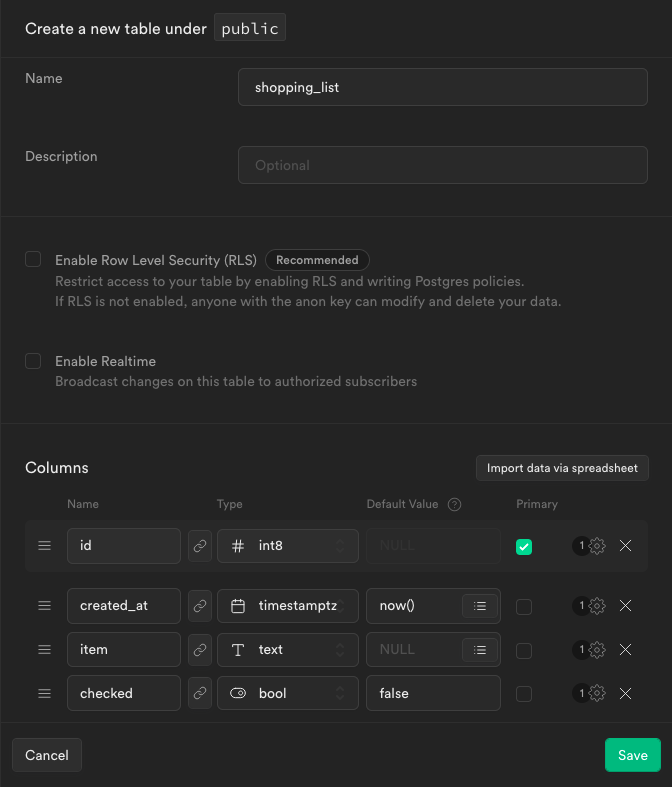 This tutorial’s example application is a shopping list, therefore the table name used is shopping_list. The table has an item column with text content along with a checked column with bool content and a default value of false. This is in addition to the default columns id and created_at.